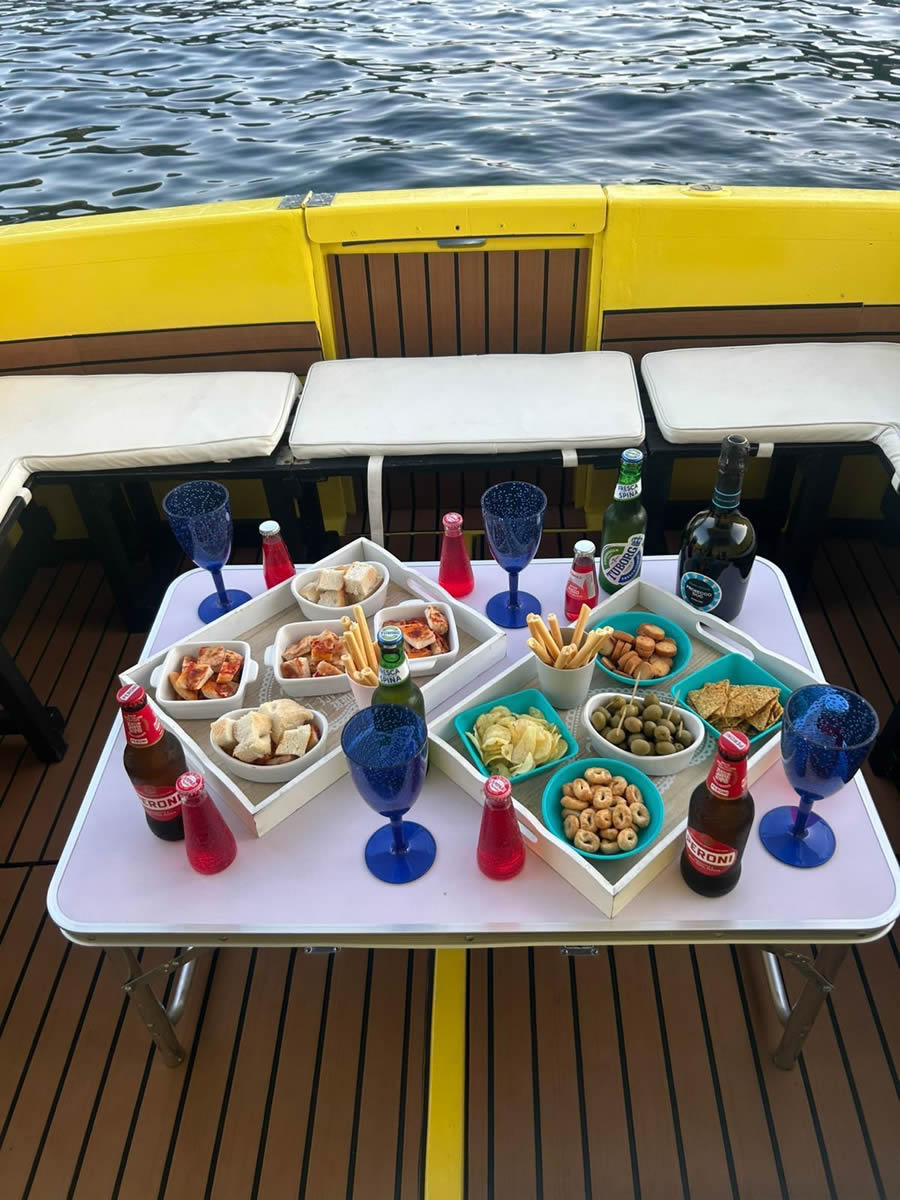 Sono presenti vari servizi: frigobar ben fornito (no alcolici), una cabina di prua con cuccetta matrimoniale ideale per pisolini bimbi e bagno con servizi igienici.